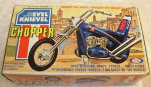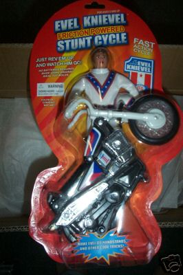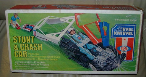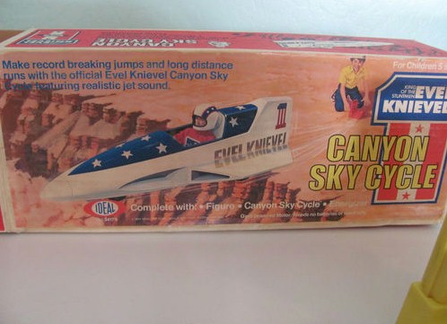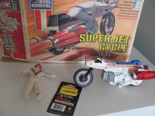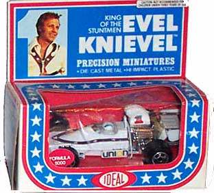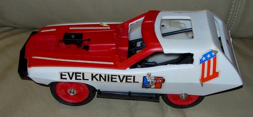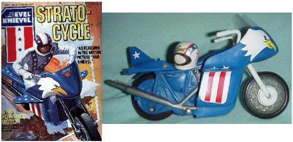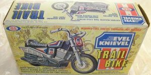 In addition to the Evel Knievel stunt vehicles and playsets, Ideal also found much success with several die-cast Knievel vehicles, a series of miniatures, and even a board game. This sounds like quite a lot already, but other companies produced countless other Evel Knievel toys and novelties. There were Knievel lunchboxes, bicycles, comic books, pillowcases, bedsheets, trashcans, radios and model rockets. There was even an Evel Knievel electric toothbrush that was designed to look like the famous X-2 Sky-Cycle. Several of the classic stunt-toys were also reissued by Playing Mantis Toys in 1998 and found much favor with nostalgic Knievel fans. The continued popularity of these toys shows that Evel Knievel and the toys he inspired are phenomena with true staying power.