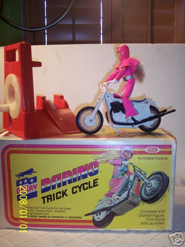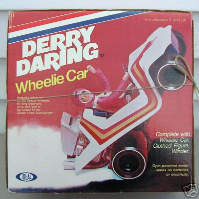 In an effort to grab the attention of young girls everywhere, Ideal released Derry Daring in 1976. Although the line was not a huge success, it included such great items as a Trick Cycle (of course), Wheelie Car and Baja Camper.