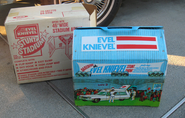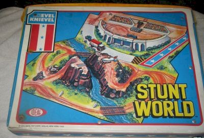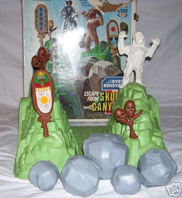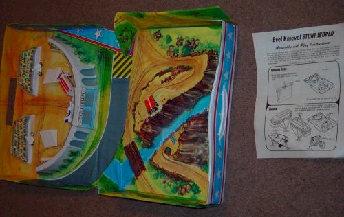 Ideal Toys also unveiled a series of playsets to provide unique backdrops for the antics of the Evel Knievel stunt vehicles. There was the Stunt Stadium, which included a ramp and cheering crowds painted into its bleachers, and Stunt World, which included a three-dimensional obstacle course for Knievel to ride his cycle through. One of the strangest Evel Knievel playsets was the Escape From Skull Canyon set, which included a werewolf-style monster, boulders, and skull-adorned trees as obstacles for Knievel.