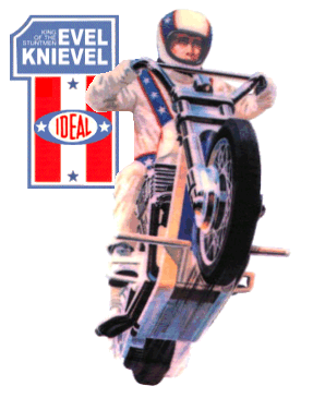 The Evel Knievel figures were a big hit and were quickly followed by the next logical step: stunt vehicles. After all, everyone wanted to fly as high as Knievel but no one wanted the multitude of broken bones that would inevitably be involved. Thus, Ideals Evel Knievel stunt vehicles provided a perfect solution to this dilemma. This long-lived line of vehicles began with the Stunt Cycle, a working miniaturized cycle piloted by a bendable Evel Knievel figure. The cycle was powered by a hand-cranked power launcher that got its engine going and could then be launched towards any stunt-obstacle its users fevered imagination could dream up. Lastly, there was Evel's favorite weekend retreat vehicle - the Scramble Van!